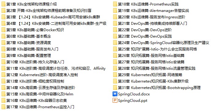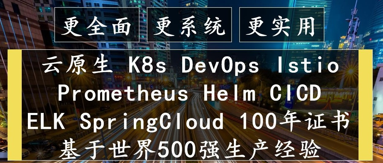 SpringCloud项目生产级容器化视频跟着官方进行更新;100年证书k8s快速入门与实战,k8s集群管理,避免踩坑Kubernetes基础、进阶及核心资源的使用;Kubernetes高可用集群搭建;100年证书Jenkins pipeline的编写及持续集成、持续部署,业务应用容器化流水线设计;Docker基础;Docker镜像制作;Dockerfile编写;Docker镜像优化及高级优化k8s多租户权限管理、持久化存储、动态存储、CSI的使用;Prometheus监控告警的使用Isito入门与实践;k8s入门实战;避免踩坑;云原生理念;日志收集Fluentd;Filebeat