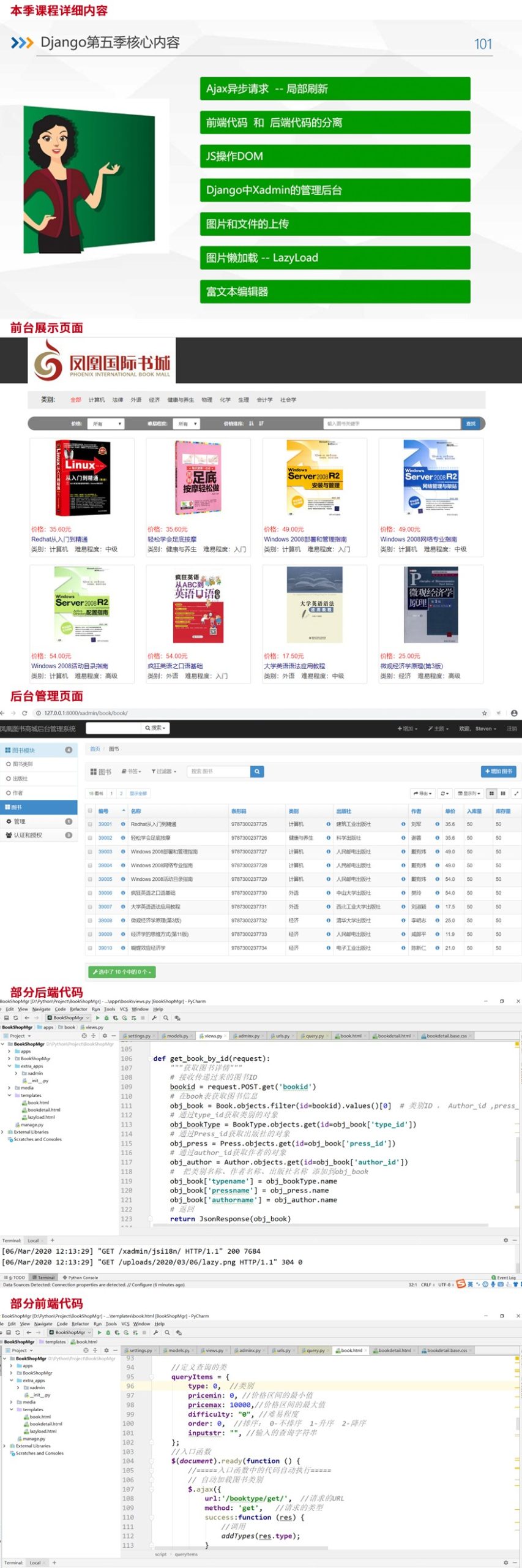 主要内容包含:理解Web开发的前台和后台、异步Ajax请求的介绍和演示、实现前后端代码的分离、使用JavaScript操作DOM的增删改查、使用Xadmin作为Djano的后台管理、使用django-stdimage插件实现图片的上传和展示、使用jQuery中的LazyLoad实现页面中图片的懒加载、使用CKEditor富文本编辑器来编辑图书的详情等等。