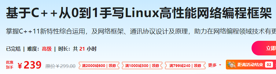 深度掌握网络编程是逆袭成为高阶开发者的秘密法宝,本课程深度讲解基于C++的Linux高性能事件驱动网络编程框架的设计方法及技巧,课程中采取渐进迭代的授课方式,配合C++11新特性的使用,以及网络编程理论的深度讲解,并手把手带着大家落地实现,助力在网络编程领域有更大的技术提升